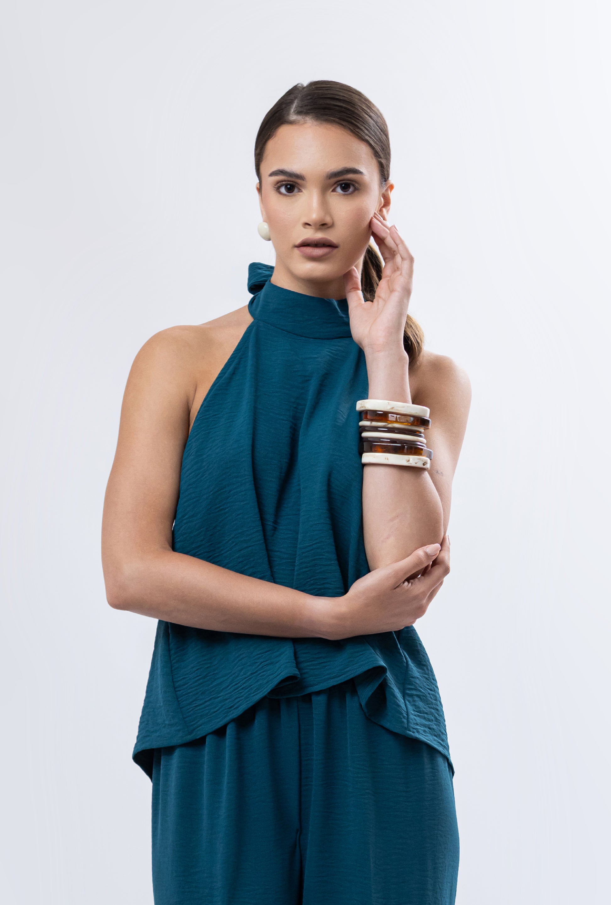 Sleeveless halter top featuring a high neckline with tie closure and an open low back. Designed with a relaxed fit and fluid drape, it offers comfort and sophistication for day or night styling.