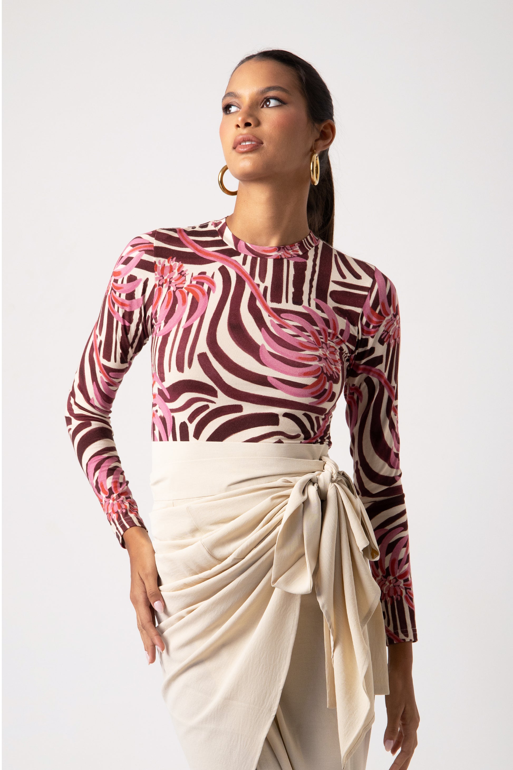Fitted long sleeve top featuring a crew neckline and our signature print. Crafted in a soft, breathable fabric, it is perfect for layering or wearing on its own. A timeless essential with a unique twist.